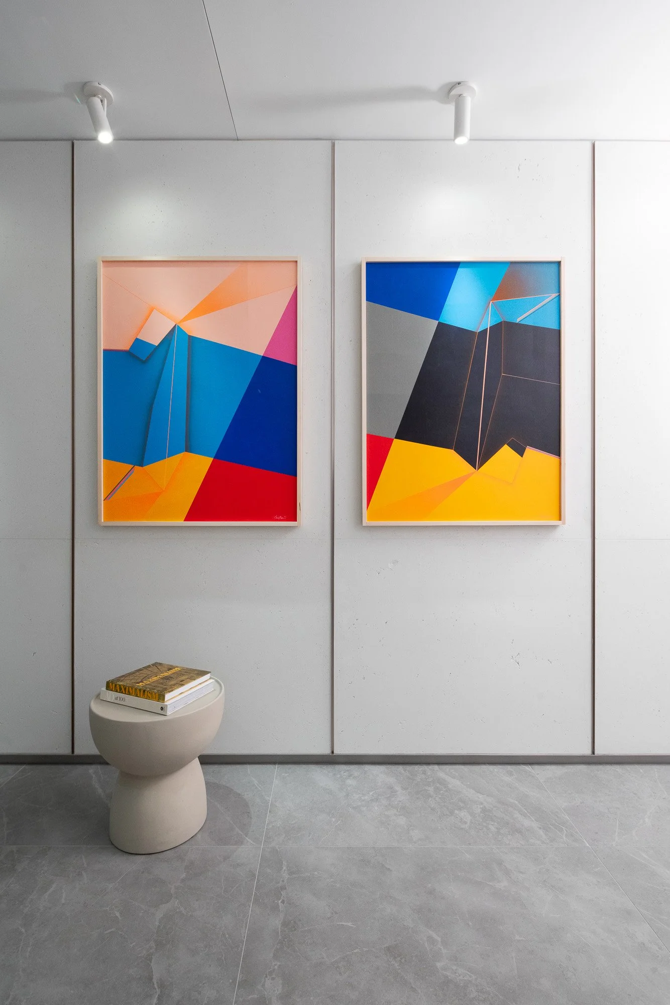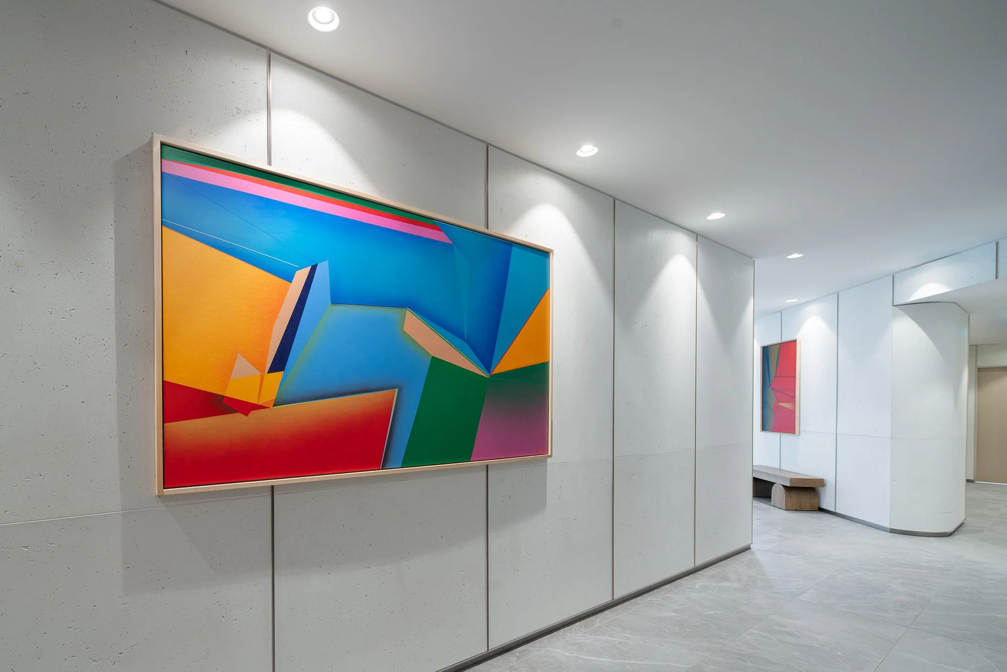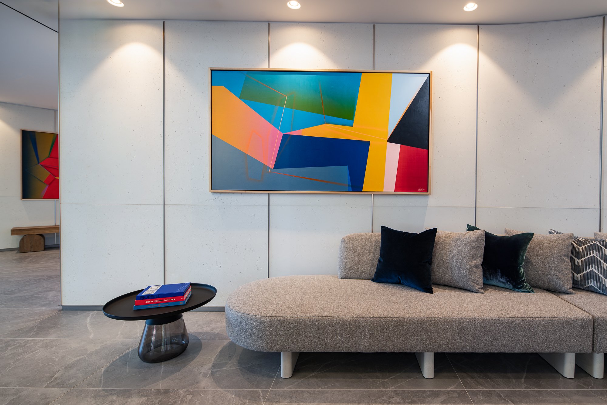 Commissioned by II BY IV Design for the Hines Tridel Aqualuna development in Bayside Toronto, this suite of twenty original paintings by Kal Mansur reimagines his signature aesthetic for a residential-scale environment. The works employ the same refined language of layered colour, translucency, and subtle geometry that distinguish his sculptural and plexiglass installations, now rendered in the language of painting to respond to interior architectural spaces. Together the paintings establish a cohesive visual identity, anchoring the large-scale living and common areas with a unified sense of rhythm, light, and atmosphere.