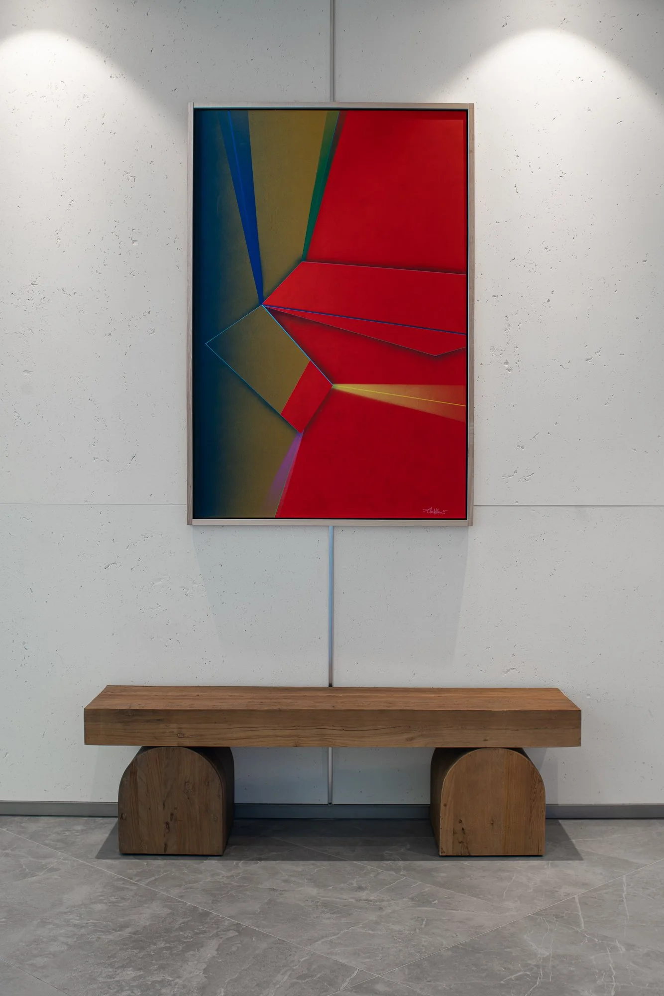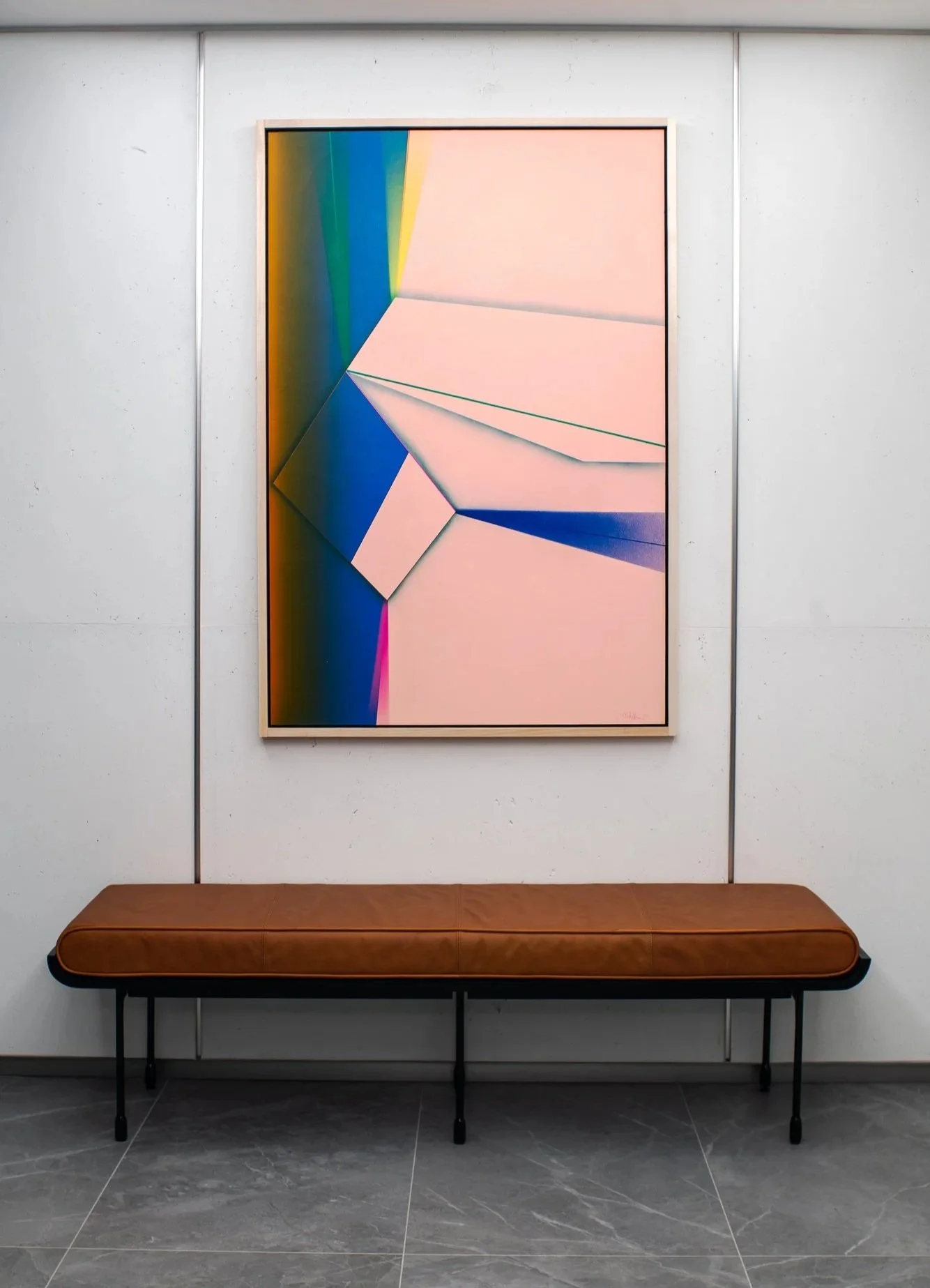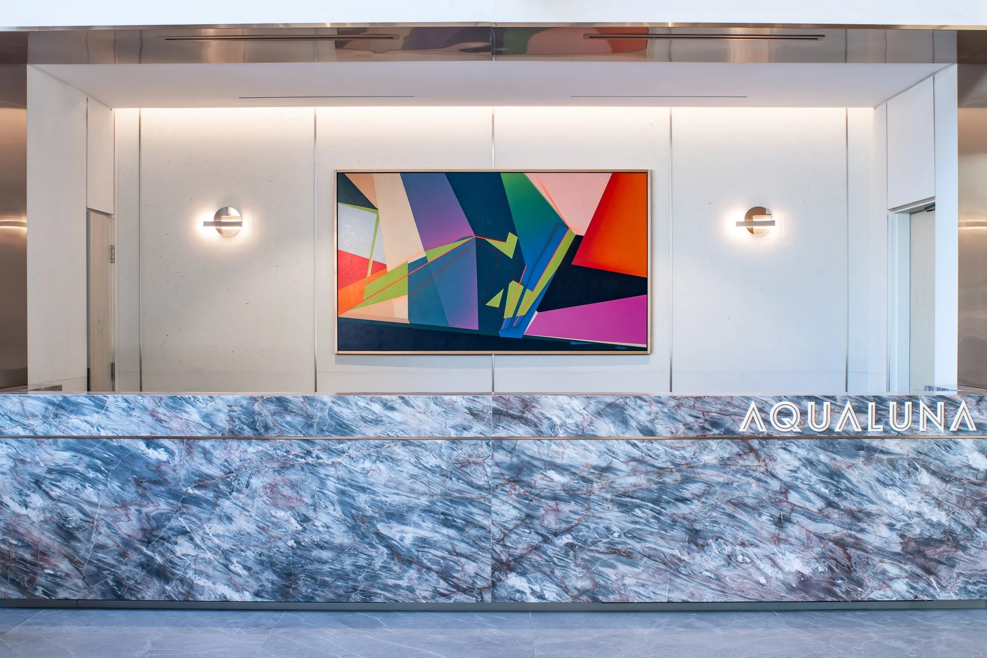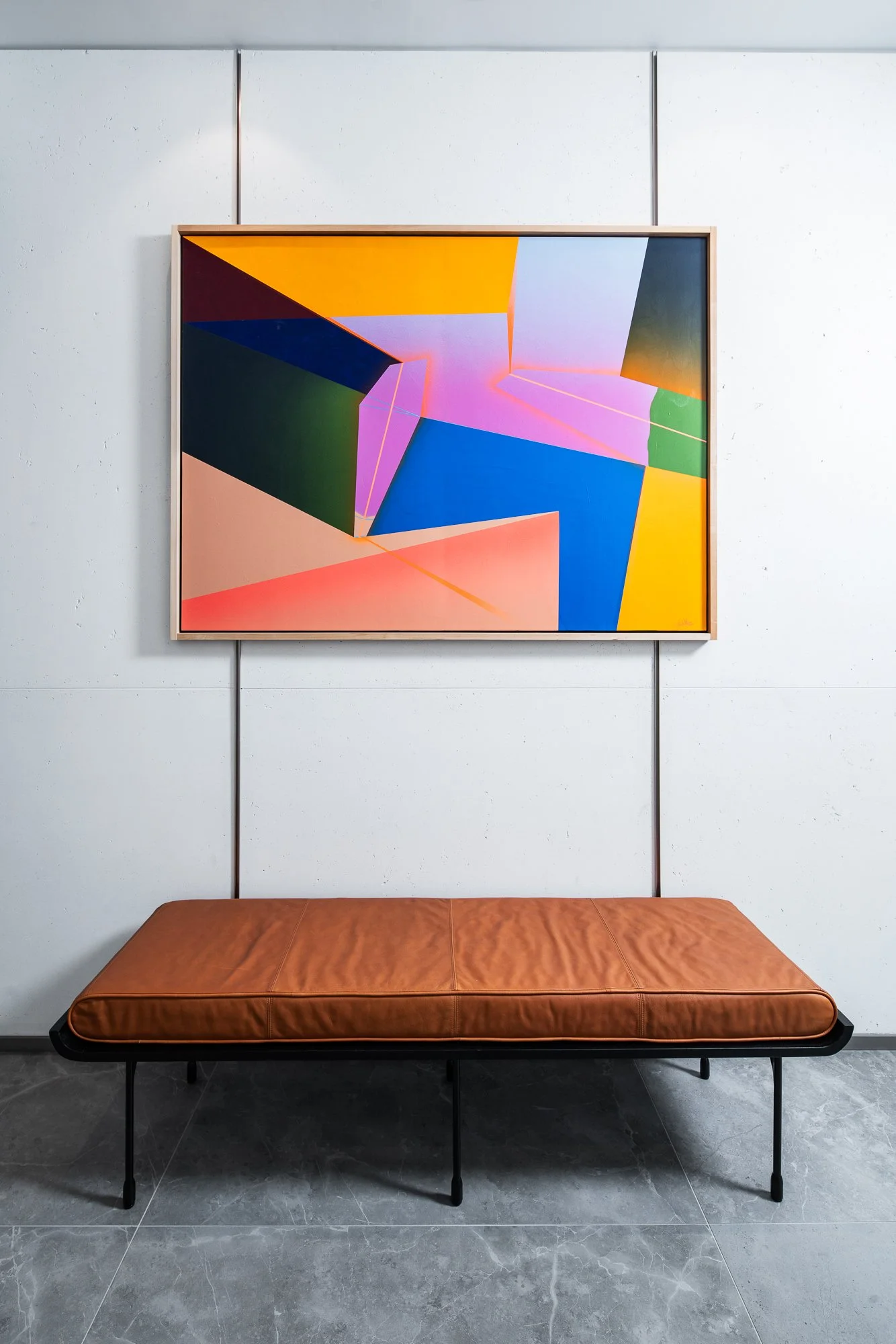 Commissioned by II BY IV Design for the Hines Tridel Aqualuna development in Bayside Toronto, this suite of twenty original paintings by Kal Mansur reimagines his signature aesthetic for a residential-scale environment. The works employ the same refined language of layered colour, translucency, and subtle geometry that distinguish his sculptural and plexiglass installations, now rendered in the language of painting to respond to interior architectural spaces. Together the paintings establish a cohesive visual identity, anchoring the large-scale living and common areas with a unified sense of rhythm, light, and atmosphere.