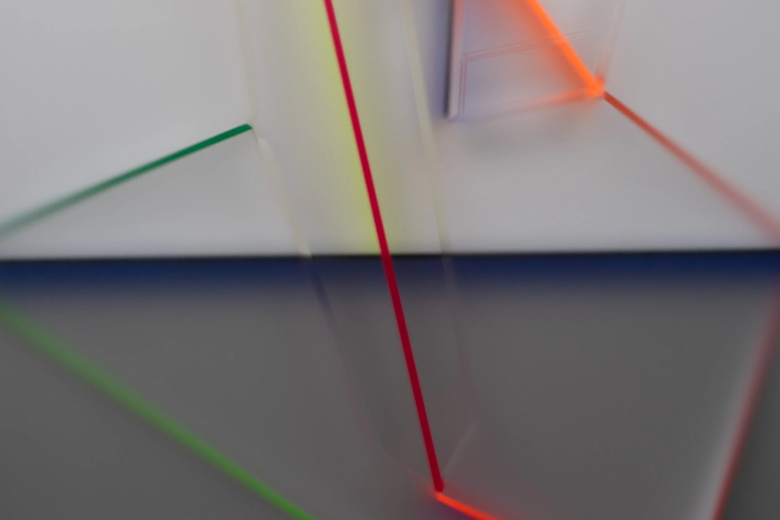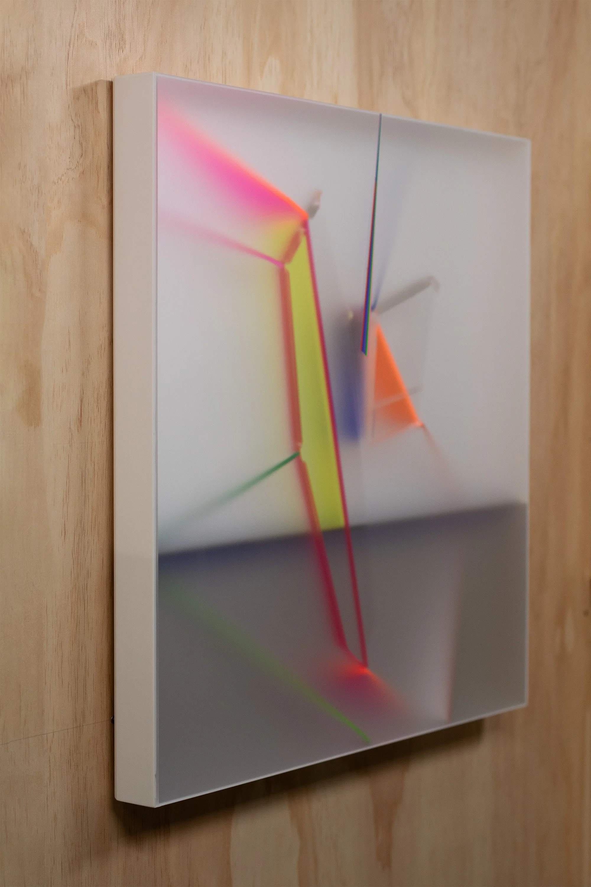 Kal Mansur’s wall works are luminous objects that play with light and depth. A nested form hovers within a translucent plexiglass enclosure, capturing ambient light. Edges ignite with vibrant color, casting a glow that is at once contained and expansive. Painted areas frame this interaction, with lines extending outward or softly dissolving, bridging painting and sculpture. The result is a prism-like invitation, bending light, deepening shadows, and inviting the viewer to travel through the composition. Click here to view Kal’s process.