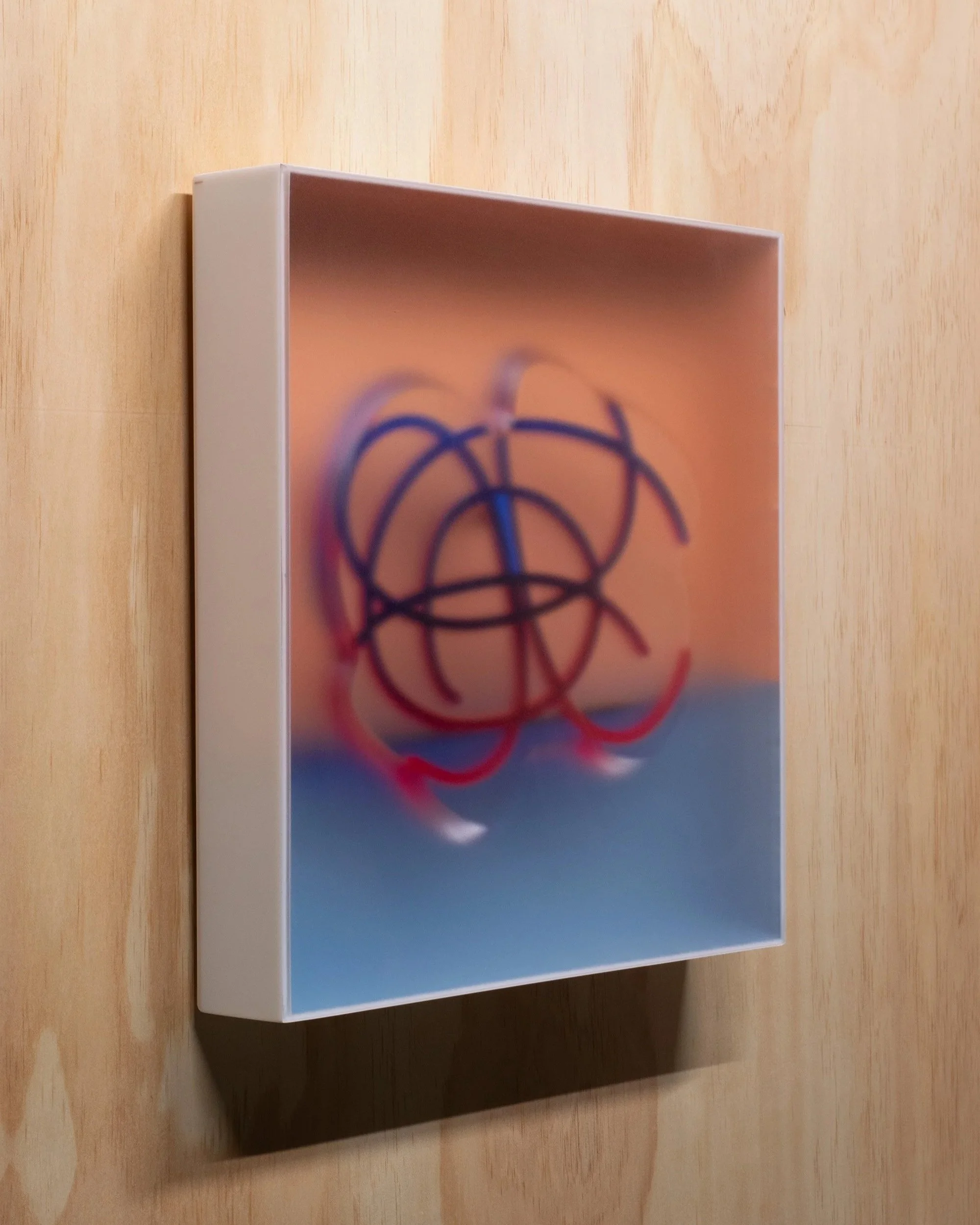 Constructed in plexiglass with painted acrylic elements, each piece continues Mansur’s pursuit of contained radiance: work that appears to power its own light.