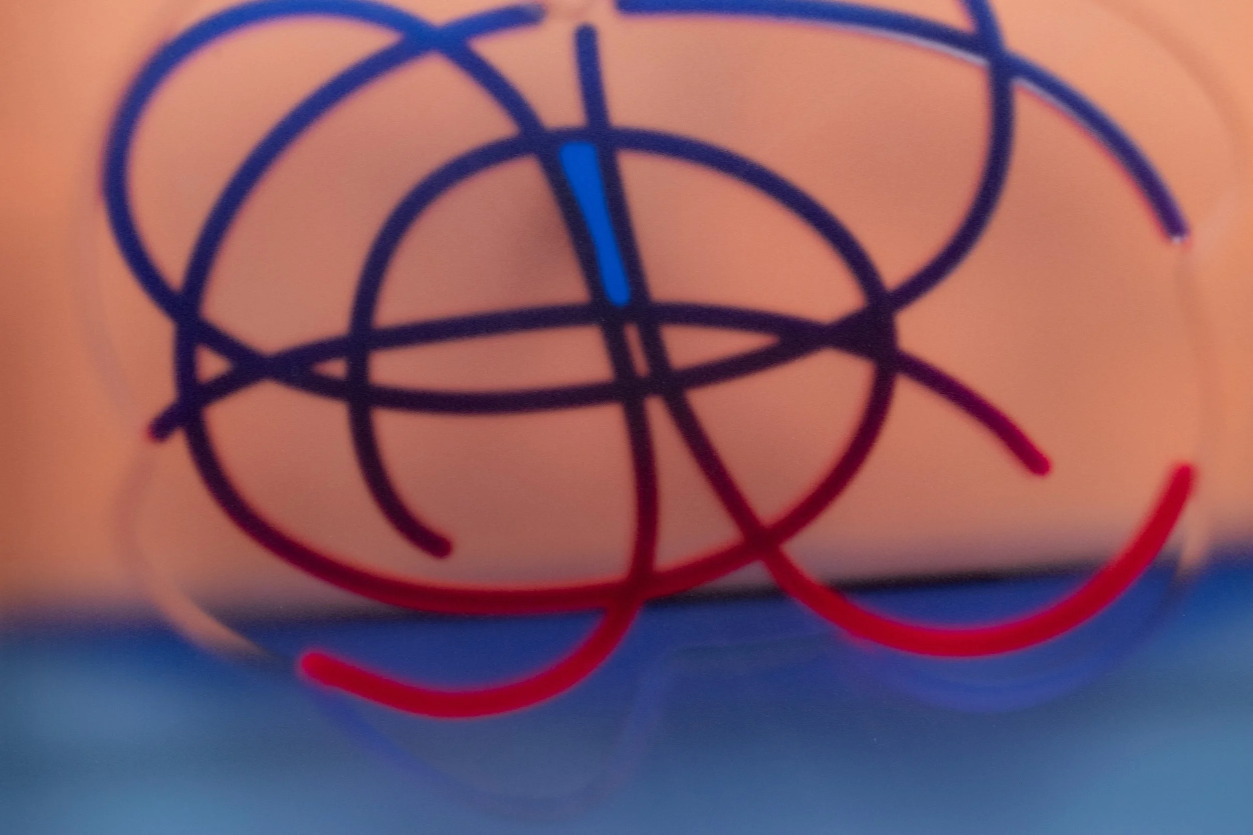 This phenomenon grounds a new series by Kal Mansur. Looping, intersecting lines hover within layered fields of color, as if still being drawn. The composition suggests a drifting current, a subtle undertow, or the simple pleasure of a line that keeps moving.