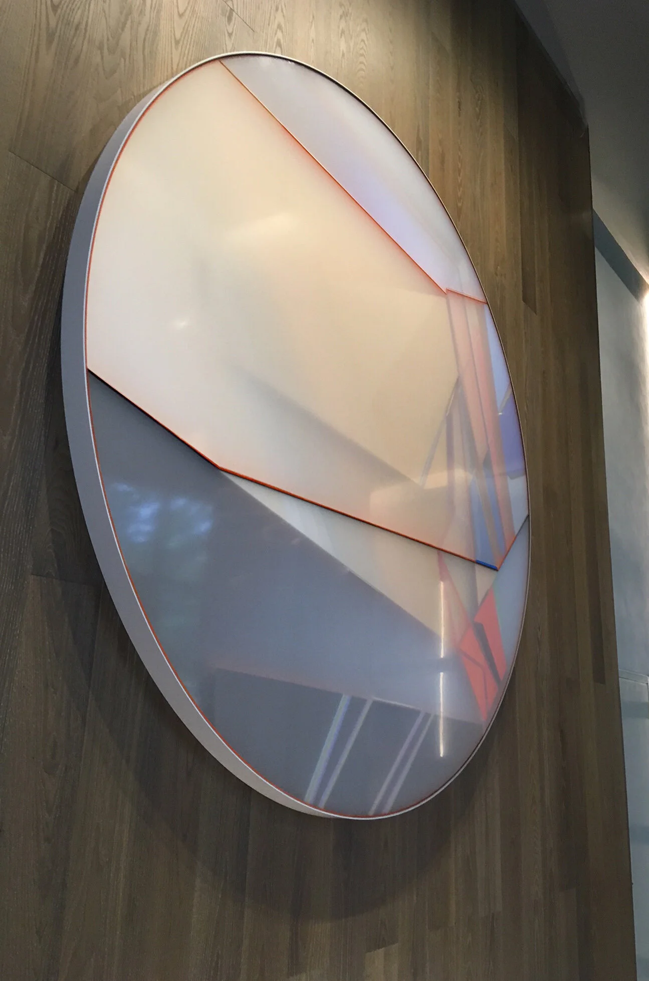 A built and painted sculpture is housed within translucent acrylic panels that cause the internal elements to shift under changing light and viewing conditions. The light casts internal shadows, illuminates other segments, and allows the viewer to visually travel through the composition.